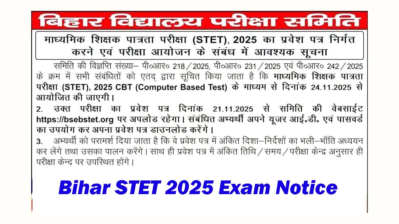 The Bihar School Examination Board (BSEB) has announced the new exam date for STET 2025. The exam will begin on November 24, 2025, and the admit card will be released on November 21, 2025.